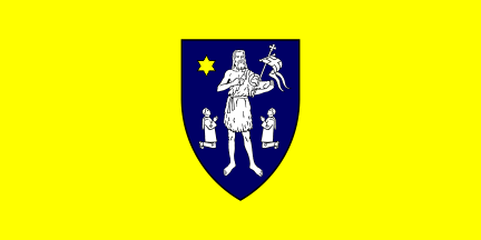 The flag is in proportions 1:2, yellow with the coat of arms in the middle.