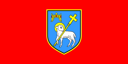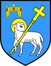 The coat of arms is "Azure a lamb passant argent holding a cross-staff or an in the canton Zvonimir's crown or with stones gules".