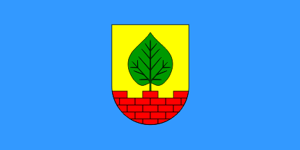 The flag is prescribed as light blue with the municipal coat of arms set in the centre, the height of the coat of arms being one half of the flag's width.