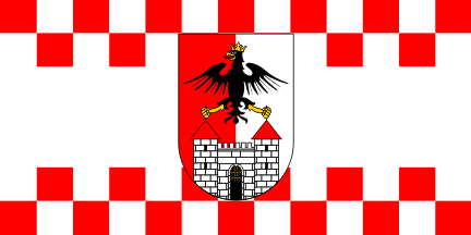 The white flag with two rows of red and white squares along both the top and bottom edges with the bicolor background coat of arms in the middle appeared in 2003, with little chance to be approved by the Ministry.