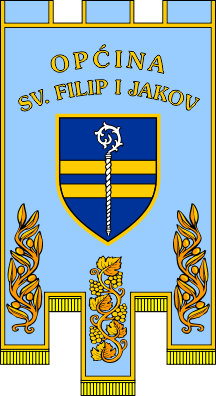 The coat of arms of the municipality is the historical coat of arms of the Municipality of Sveti Filip i Jakov. The coat of arms is in a shield, on a blue field, in the center a bishop's crozier and two yellow lines.