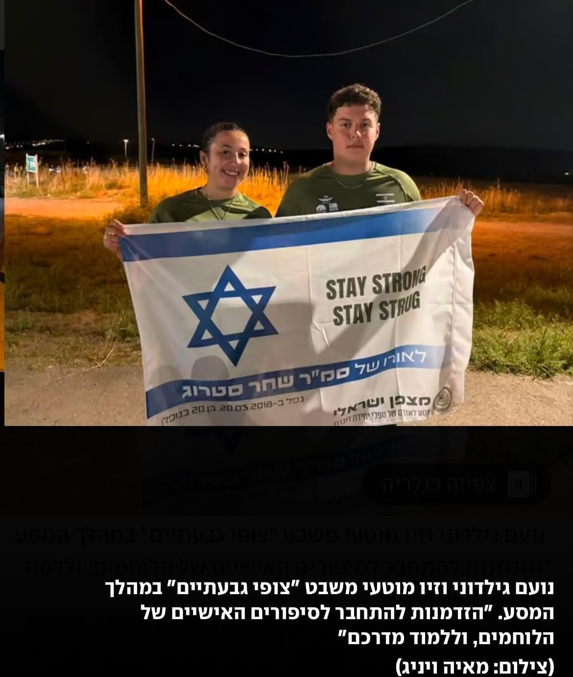 bottom blue stripe in white reading "לאורו של סמ"ר שחר סטרוג"