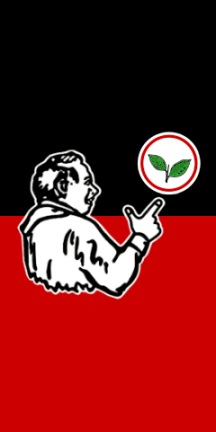 The flag of AIADMK is described in the Article 4 of the party Constitution ("Rules and Regulations", as officially called) as a black-red horizontal bicolor with the white bust of Annadurai in center, depicted as pointing with his forefinger towards the fly; the ratio is 2:3. While the shade of red is not specified, R+ is typically used.