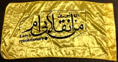 A yellow-field flag with a black unknown slogan in Arabic and a secondary slogan in English reading "I am a Revolutionary", used by Iran-backed PMF (Popular Mobilization Forces) in Iraq & Lebanon to defend Shia-Muslim holy shrines; c. Jan. 2022.