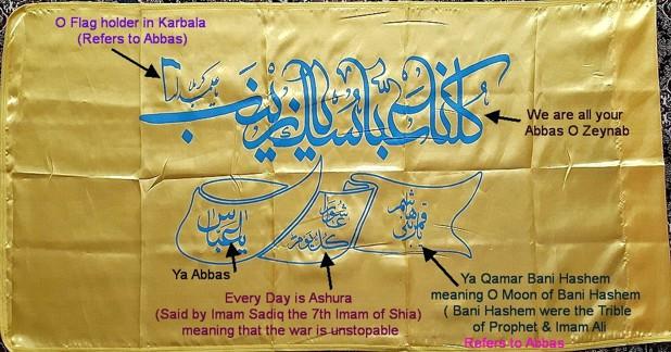 Regarding this flag, the top large slogan reads: "Oh, Zeynab, We are all your Abbas" -- referring to Zaynab's championing the bravery of the Hussain clan -- sort of like Abbas' parading the Hussain flag in a spirited "Rally around the (clan) flag" moment. Also, at the far left, atop what appears to be a long horizontal line, there is a smaller slogan with a small "flag" at the far left, that reads: "Oh, Flag holder in Karbala" (again, referring to Abbas' parading of the Hussain flag). So, the conjoined top slogan is a chant for Shia/Shiites to inform the spirit of Zeynab that modern Shiites today "rally around" in remembering the bravery of Zeynab in touting the heroic deaths of her relatives at the Battle of Karbala, just as Abbas carried the Hussain-clan flag to "rally around" defending Hussain during the battle.