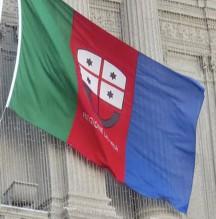 The flag displayed at the Liguria government building is different from the one at the top of this page. The silver caravel is a darker shade and the name is included in white below the caravel.