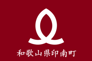 flag has a white town emblem in the center and the kanji name of the prefecture