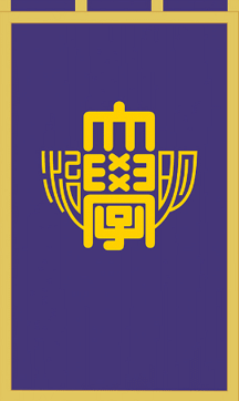 The embroidered ceremonial hanging flag has deep purple background with a gold emblem with gold border.Adopted in April 1915. The color "deep purple," the highest on the color scale, was chosen to express the hope for improvement. The school color was decided by the then principal Yuzaburo Kinoshita.