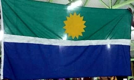 It is green over blue, separated by a narrow white stripe, with a yellow sun(?) symbol on the green band.