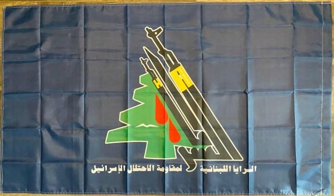 A clearer image of a "Saraya al Moqawama el Lebnaneya" or "Saraya al-Muqawama al-Lubnaniyya" flag (second flag above) features the group’s standard emblem/logo: two stylized rifles (and a bayonet in the middle) rising diagonally in front of a green cedar silhouette with two red blood-drops symbolizing sacrifice. The green cedar tree is featured prominently in Lebanese culture. The Arabic text along the bottom reads: السرايا اللبنانية لمقاومة الاحتلال الإسرائيلي (when read right-to-left reads: "alsaraya allubnaniat limuqawamat alaihtilal al'iisrayiylii"), or in English as: "The brigades Lebanon resistance against/ occupation Israel" or more colloquially as: “The Lebanese Resistance Brigades against the Israeli occupation” (of southern Lebanon at least, and indirectly of all Israel-Palestine). The black AK-47 rifles are slanted and stylized to read: "al-Sarya" ["The Brigades"] and mimic Hezbollah-logo imagery. From the source website: "The combination of the cedar silhouette, rifles, and blood-drops symbolism reflects the group’s attempt to merge Lebanese national imagery with resistance themes, distinguishing it visually from Hezbollah’s primary insignia." The yellow areas on the upper area of the rifles indicate their wooden upper handguards. There is a hidden flagpole-sleeve at the right hoist side. Some Lebanese Sunnis have charged the Iranian-Shia-oriented "Resistance Brigades" with focusing more on countering Sunni fundamentalism inside Lebanon than countering Israel, per Wikipedia: https://en.wikipedia.org/wiki/Lebanese_Resistance_Brigades