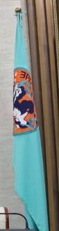 The flag is light blue (or teal?) with modified district emblem in the center, with name of district below. It has three tails (red, yellow and blue) at the fly.