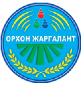 Over a circular device outlined in blue, it reads "ОРХОН ЖАРГАЛАНТ" in the center. Above this are three droplets; one in green, blue, and red; these are the representative colors of the natural world, red being for fire. Surrounding these are rays of yellow, which can be a representation of the sun. Under the text is a half of an asterisk (*) shape, representing the fields and their agriculture. Under this are two crossed branches, likely wheat, a product of the land.