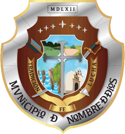 In time for the 438th anniversary of Nombre de Dios in the year 2000, a contest was held. 44 submissions were received then presented to the Contalpa community museum. Unanimously, the jury (composed of María del Carmen Torres Meléndez and the chronicler Heriberto Hernández Velázquez) elected a design under the pseudonym "Pinocho" on 7 October. Over a silver border, at the top MDLXII is read, the year 1562, when this place was founded by Francisco de Ibarra. At the bottom, MUNICIPIO D NOMBRE D DIOS. Over brown, there are 7 stars at the top, the number of perfection associated with God, who the municipality is named after (Name of God lit.) At the bottom, a ribbon reading TRADICIÓN FE LUCHA [Tradition, Faith, Fight] as a motto. Behind the innermost shield are a crossed arrow and sword, signifying the conflicts between the two groups. At the top, hills are visible, typical of the environment. To the left, the El Saltito waterfall which Nombre de Dios is known for. To the right, the Temple of Saint Francis of Assisi, the first Catholic church in Durango. A cross divides the sections, remembering the faith.