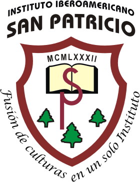 Establecido en 1982, el escudo tiene forma de escudo tradicional, su silueta en color guinda y el fondo blanco. En el centro del escudo un libro abierto como símbolo de la enseńanza. Arriba del libro en números romanos encontramos la fecha de fundación del Instituto, 1982 (MCMLXXXII). Encima del libro y extendido hacia abajo encontramos un símbolo formado por las letras S y P, siglas de San Patricio. En la parte inferior del escudo se encuentran tres pinos, muestra de la filosofía profundamente ecológica que siempre hemos tenido. Con letras negras, en formación curva, aparece arriba del escudo mismo el nombre completo del colegio: "Instituto Iberoamericano San Patricio". Este texto se le agregó en 1989. En la parte inferior, por fuera del escudo y siguiendo el contorno del mismo aparece la leyenda: "Fusión de culturas en un solo Instituto". Originalmente dicha leyenda decía "Dos culturas en un solo Instituto", esto se cambió en 1999 por "Tres culturas..." con la inclusión del japonés, y en 2001 se volvió a modificar a causa de que el idioma francés se incluyó en la retícula del colegio.