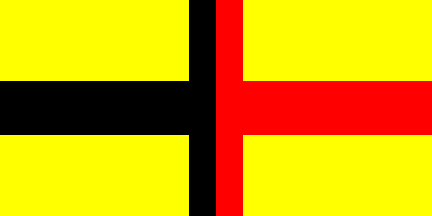 Flaggenbuch 1939 shows the Standard of the Rajah with the same pattern, yellow field with a centered cross vertically divided red and black, forked with red triangles along the fork mouth and a golden crown in center, [but the crown somewhat different]. Proportions 7:11.