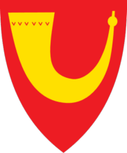Blazon: I rødt et gull drikkehorn. In English: Gules a drinking horn or.