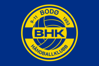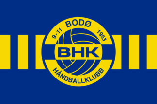 The flags of Bodø HK (Bodø Håndballklubb) from Bodø are dark blue with the badge in yellow. A variant has an interrupted horizontal stripe in yellow.