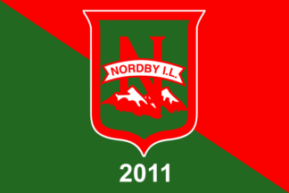 The flags of Nordby IL (Nordby Idrettslag) from Nordby in Ås Municipality are diagonally divided red over green with the badge centered.