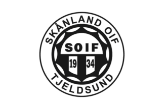 The flag of Skånland OIF or SOIF (Skånland og Omegn Idrettsforening) from Evenskjer in Tjeldsund Municipality, ex Skånland Municipality, is white with the badge centered.