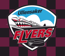 The flag of the hockey team of Ullensaker Issportklubb named Ullensaker Flyers from Jessheim in Ullensaker Municipality is chequered deep red and black with the badge centered.