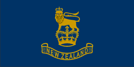 the badge to be worn in the Union Jack used by the Governor of New Zealand when embarked in any vessel {shall be the Southern Cross as represented by four five-pointed red stars emblasoned on a white shield, with the monogram "NZ" in red letters in the centre of the Southern Cross}. Succeeding Governors found it convenient to use this flag on shore [as in the rest of the Empire] and it became accepted as the official vice-regal flag. In 1907, following New Zealand's promotion from "colony" to "dominion", New Zealand ministers asked that the garland of laurels should be replaced by one of fern leaves, [which, of course, is one of NZ's national symbols]. With this alteration, the flag continued to be used by successive Governors until about 1935. In January 1931, a new vice-regal flag was designed... [the Royal Crest in Gold, with the name of the Dominion in gold beneath, all on a blue field]. As neither Lord Bledisloe, [whom I assume was Governor in the early 1930s], nor his ministers were sympathetic to the change, the flag was not favoured until after Lord Galway's arrival [whom I assume became Governor General of NZ c.1935].