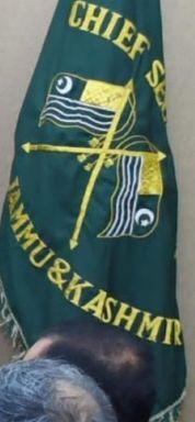 The flag of the Chief Secretary is a green field depicting, in its center, two Azad Kashmir flags crossed together. Above this, CHIEF SECRETARY is read (curved); underneath, JAMMU & KASHMIR is read (curved). All text is in gold.