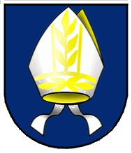 "Arms: on the blue shield a silver infula (bishop's mitre) gold embroidered.