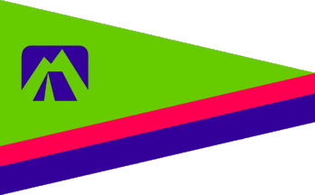 These are of two sorts, based on the same basic design: Main field in light green with dark blue logo on the upper hoist and double stripe of reddish over dark blue along the bottom edge. The large flag (90 cm at the hoist) tappers to a stub end parallel to the hoist taking up fully the bottom stripe, while the small flag (30 cm at the hoist) tappers to a pointy tip. There were made two copies of the large flag and about a dozen of the small one.
