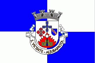 Flag and arms are the nearly the same as those of Prazeres de Aljubarrota (see above). The only differences are the inscription of the scroll, reading "S. VICENTE - ALJUBARROTA" and the shield here is parted per chevron rayonné.