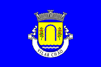 Shield Or an arch Azure masoned Argent flanked by two almond branches Vert fruited Gules set in pale and on a base wavy Azure a bendlet wavy Argent. Mural crown Argent with three visible towers(village rank) white scroll reading in black upper case serifed letters "VILAR CHÃO".