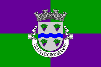 Shield Argent between two bunches of grapes Purpure leafed and stemmed Vert a castle Sable with port and windows Argent, and on base wavy Azure a fess wavy Argent. Mural crown Argent with four visible towers (town rank) and white scroll reading in black upper case letters "CELORICO DE BASTO"
