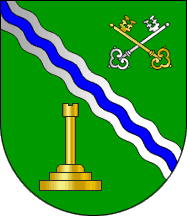 Shield Vert parted by a bend wavy of silver-blue-silver; on sinister chief two keys in saltire, one Or and the other one Argent; on dexter base a pillory Or.