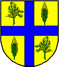 Shield Or parted by a centred cross Azure, on dexter chief and sinister base a broom branch Vert, on sinister chief and dexter base a rye ear Vert.
