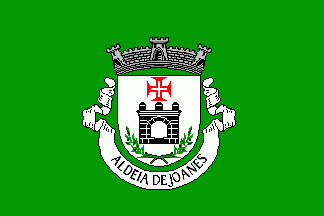 Shield Argent an arch embattled Sable between a cross of the Order of Christ on chief and two olive branches Vert fruited Sable in saltire on base. Mural crown Argent with three visible towers (village rank) and white scroll reading in black upper case serifed letters "ALDEIA DE JOANES".