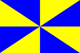 It is a fairly typical Portuguese municipal flag, with the coat of arms centred on a field gyronny of 8 of blue and yellow.