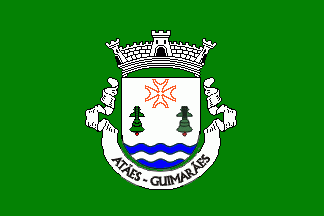 Shield Argent with base wavy of Azure and Argent, two bells Vert with bobbins Gules set in fess, in central chief a Maltese cross Argent fimbriated Cinnabar. Mural crown Argent with three visible towers (village rank)and white scroll with inscription in black capitals "ATÃES - GUIMARÃES".