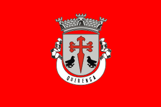 On a silver field a red Santiago cross flanked by two black hawks facing each other. Three silver towers mural crown, white scroll with the lettering "QUERENÇA".