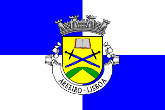 Shield Or two swords inverted Sable with sheaths Azure and garnished Argent set saltirewise, in chief an open book Argent bound Gules, on a mound Vert issuant from base a pile reversed Or. Mural crown Argent with four visible towers (town rank) and white scroll reading in black upper case letters AREEIRO - LISBOA.