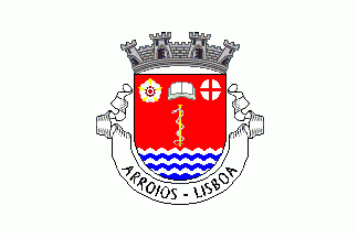 Shield Gules with base wavy of Argent and Azure; a rod of Asklepios Or with serpent Argent; in chief a heraldic rose Argent, seeded Gules and barbed Or at dexter, an open book Argent in centre, and a plate charged with a throughout cross Gules at sinister. Mural crown with four visible towers (town rank) and white scroll with inscription in black capitals "ARROIOS - LISBOA".