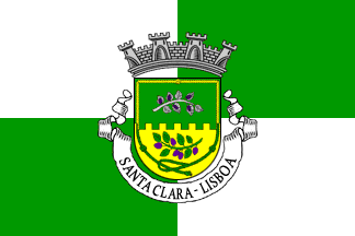 Shield Vert on a wall embattled Or issuant from base a plum tree branch Vert fructed Purple, in chief a mulberry branch Argent fructed Purple with its proximal end at the sinister, in orle a Franciscan cordon counterchanged. Mural crown Argent with four visible towers (town rank) and white scroll reading in black upper case letters "SANTA CLARA - LISBOA".