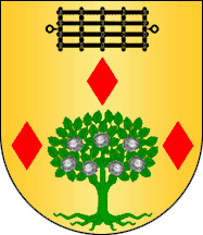 Shield Or, a chestnut tree Vert eradicated Vert and fruited Argent, between three lozenges Gules set one and two, in chief a grill Sable. Mural crown Argent with three visible towers and white scroll reading in black upper case letters "MURÇÓS"