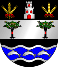 between two bundles of wheat Or each of three ears, sometimes tied Gules, in base on a wavy fess Azure fimbriated Argent,
