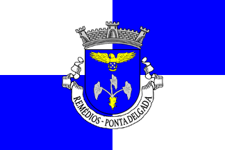 Shield Azure a three-leaf yam Argent eradicated Or, in chief a goshawk displayed Or grasping an escutcheon Azure charged with five plates in quincunx. Mural crown Argent with three visible towers (village rank) and white scroll with inscription in black initials "REMÉDIOS - PONTA DELGADA".