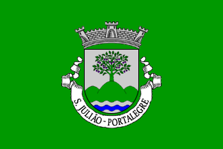 Shield Argent with base wavy of Argent and Azure, issuant from base a triplemount Vert, issuant from the central peak a cherry tree Vert fructed Purpure. Mural crown Argent with three visible towers and white scroll with inscription in black capitals "S. JULIÃO - PORTALEGRE".