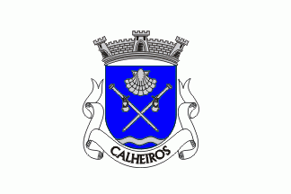 Shield Azure, two batons Argent crossed per saltire and accompanied by two canteens of the same, in cental chief a scallop Argent, in base a barrulet Argent. Mural crown Argent with three visible towers (village rank) and white scroll with inscription in black initials: "CALHEIROS".