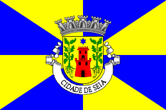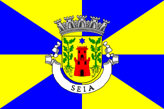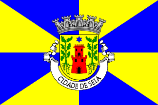 [Seia (town) municipal flag] 2:3 image by Sérgio Horta, 19 Jan 2007 The change was caused by the upgrading of Seia to city status, officialised on 23 August 1986. There were no changes to the coat of arms other than the trivial routine switch from 4 to 5 visible towers in the mural crown, but the change in flag pattern was not just the trivial switch from quarterrd to gyronny of eight , but also from red/blue to blue/yellow.