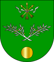 Shield Vert two olive branches Argent fructed Or with their proximal ends crossed per saltire, in chief three arrows Or tied by a ribbon Argent, in base a bezant.