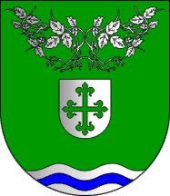 Shield Vert an escutcheon Argent bearing a cross fleury Vert, in chief a forget-me-not plant eradicated Argent, on base wavy Argent a barrulet wavy Azure.