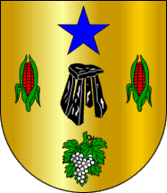 Shield Or a dolmen Sable garnished Argent, flanked by two maize ears Gules leafed Vert, in chief an estoile Azure and in base a grape bunch Argent leafed Vert.
