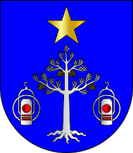 Shield Azure a pine tree eradicated Argent fructed Or, flanked by two pit lamps Argent lit Gules, in chief a 5-point estoile Or.